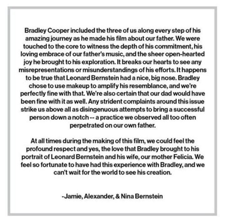 While we definitely shouldn’t conflate the two terms, wearing a prosthetic nose that isn’t even really necessary does stir up historically offensive stereotypes for some Jewish people. And even though Leonard Bernstein’s kids might be okay with Bradley’s portrayal — and let’s remember that they are also benefiting from the film — they don’t speak for all Jewish people.