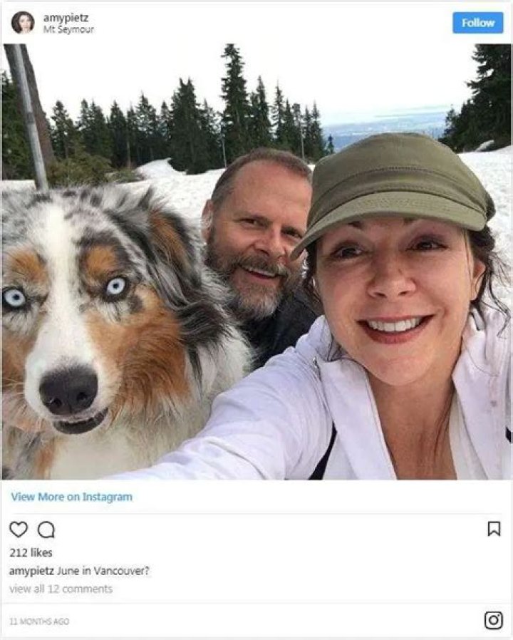 All Smiles: Amy poses with her husband and a dog in Mount Seymour in Canada in June 2017. (Photo: Amy Pietz's Instagram)