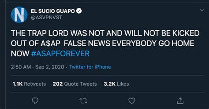 “THE TRAP LORD WAS NOT AND WILL NOT BE KICKED OUT OF A$AP FALSE NEWS EVERYBODY GO HOME NOW,” he wrote on Twitter. He then called Illz and Bari's statements “extremely embarrassing and unnecessary.”