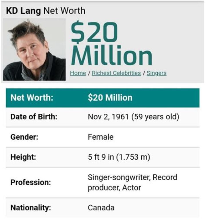 k.d. lang, the Canadian artist known for her remarkable contributions as a soundtrack artist, actress, and music department personnel, is anticipated to have a net worth ranging from $100K to $1M in 2024. With her multifaceted talent and immense dedication to her craft, lang has garnered immense recognition throughout her career. Her soul-stirring voice and ability to captivate audiences have solidified her as an influential figure in the music industry. Taking into account her numerous accomplishments and diverse range of skills, lang's net worth is expected to remain impressive and continue to grow in the coming years.