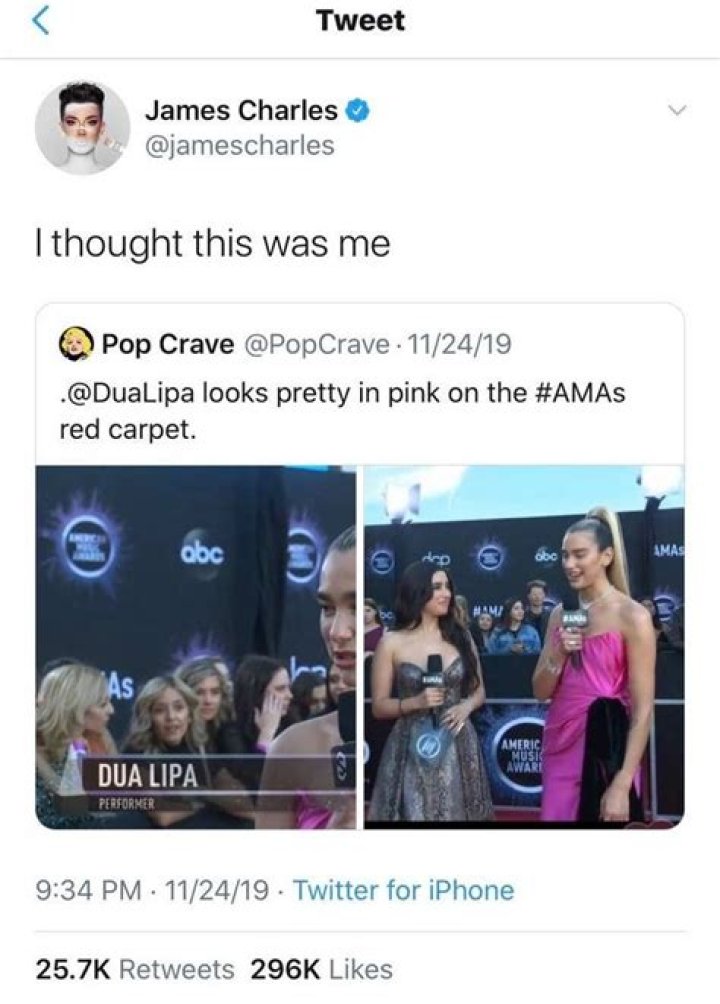 James re-tweeted a set of photos from PopCrave showing snaps of Dua on the red carpet for that year's AMA Awards. Along with the tweet, James wrote, "I thought this was me."
