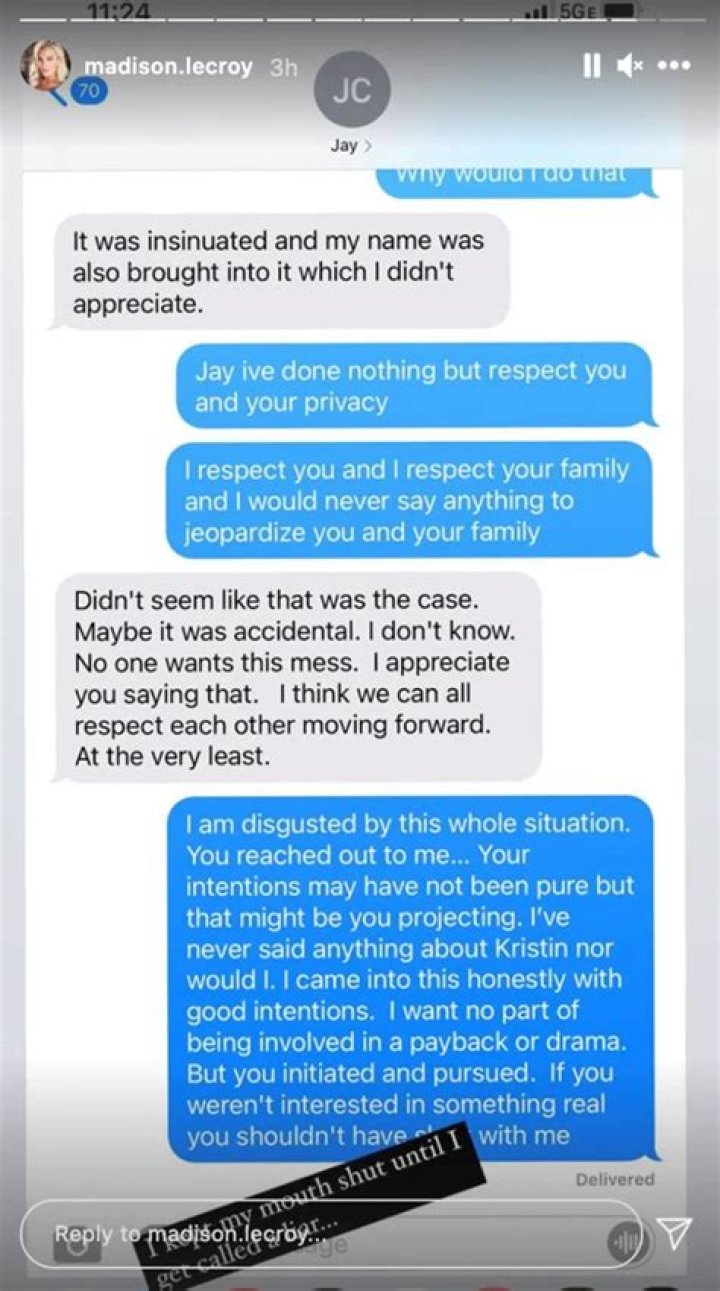 Obviously, people began to speculate that Jay and Kristin might be back together, but it soon became clear that their identical posts may have actually been in response to a live video that Madison had posted the day before. And then (after the joint IG posts), Madison posted the following screenshots, which appear to depict text convos she had with Jay: