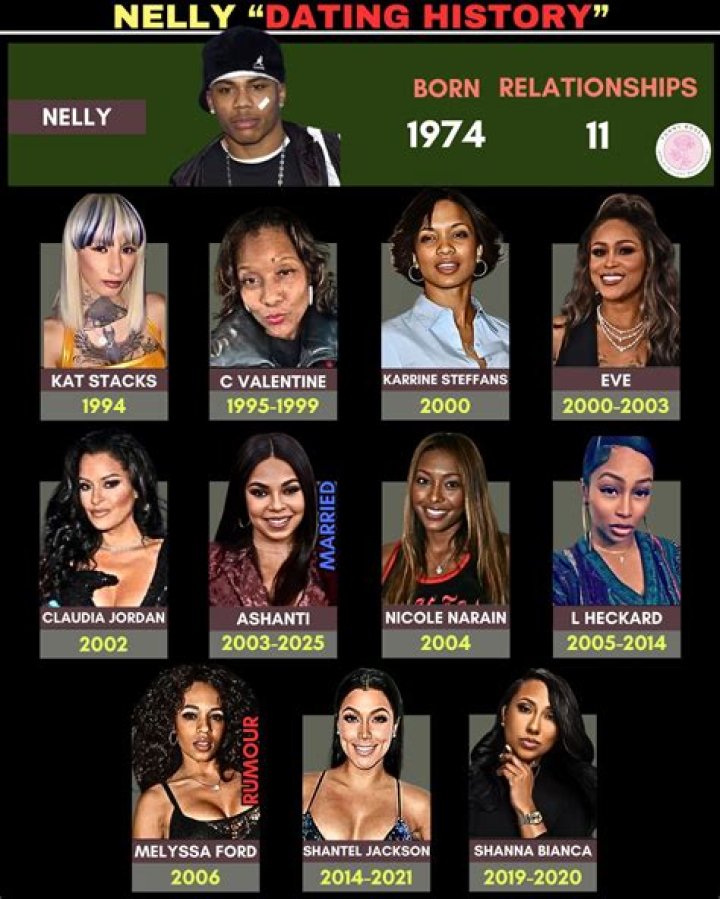 Although Nelly has had a couple of lasting, meaningful relationships, he's also been connected to a number of other women who he was only with for a short time. He dated fellow rapper Eve for several years in the early 2000s, and was also briefly connected to Kelly Rowland and Claudia Jordan during that period. In 2005, he entered a roughly 10 year relationship with Ashanti, and that relationship reportedly ended in part because Nelly was cheating with actress Leshontae Howard.